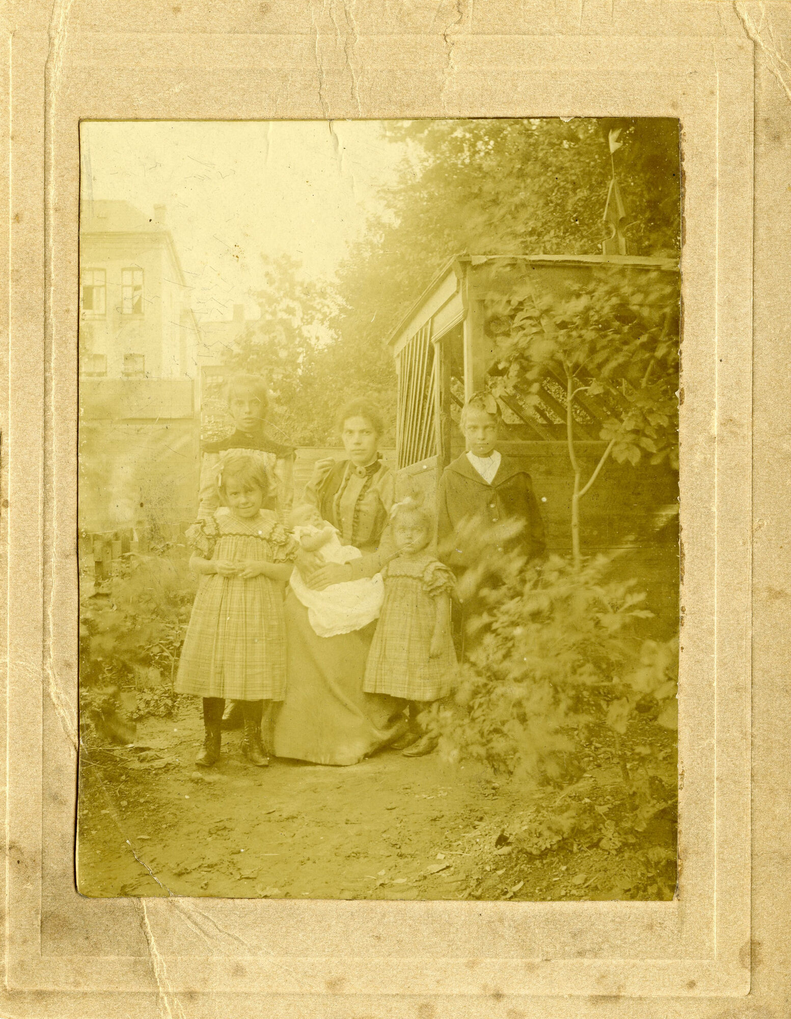 "Billedet er fra september 1901. Vores mor Ankje Petrea Marie Georg og os 5 børn. Vilhelmine 11 år. Viggo 9 år. Ketty 5 år. Ingeborg 3 år. Kaj 2 måneder [...] Jeg er født på Frederiksberg d. 3-3-1896, og vi boede på Frederiksberg nr. 9 st. […] Der hvor vi boede var der i gården en have som mine forældre havde lejet i, der blev vi fotograferet, billedet er derfra. Mens vi boede der, skete det en aften, min far kom hjem, at han havde 2 små grønlandske dukker med hjem, til min søster og mig, og så blev vi sendt ud på gaden og lege. Min far var dagvagt på den grønlandske handelsplads i Strandgade og havde fået dukkerne af nogle sømænd, som var kommet hjem fra Grønland. Nogen tid efter var min lillesøster og jeg gået hen ved Frederiksberg Have, for at vente på far, det var en fredag aften, og så plejede vi at få en 2 øre, men da det blev mørkt, kom vores storebror og hentede os, de havde ledt efter os, og han sagde så, at far kom ikke mere hjem til os, og det gjorde han heller ikke. Vi var 5 søskende min storesøster var godt 11 år og min lillebror nogle måneder og den pige min far var flyttet sammen med var 18 år. Far og mor blev separeret i september 1901. Det var en stor forandring for os alle, dengang var der jo ikke hjælp til enlige mødre, som der er nu, det var bare om at klare sig selv. Søgte man hjælpen var det fattighjælp og det gik min mor langt udenom og har også klaret sig selv og sine, selv om det tit var svært. Min mor gik ud og gjorde rent for folk, men nu fik hun en avistur, som vikar til at begynde med; men senere fik hun en fast tur på Østerbro, og så flyttede vi derud." Tekst af Ketty Margrethe Andersen.