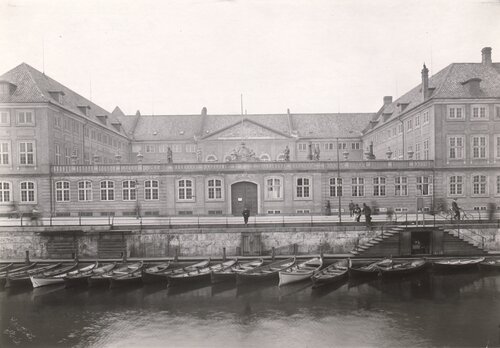 Kildetekst: Bydelen Kalvebod Rode blev indvundet ved en i Aarene 1667-68 foretagen Inddæmning og Forlægning af en Del af Kallebostrand. Reguleringen og Bebyggelsen af det store Areal, hvis officielle Navn var Friderichsholm - i daglig Tale Kalleboerne - var i de store Træk fuldendt omkring Aar 1685. Paa det nuværende Prinsens Palæs Grund opførte den rige Købmand Vigandt Michelbecker Aar 1684 en stor og anselig Gaard med Facader mod Frederiksholms Kanal og nuværende Ny Vestergade, der dengang efter ham fik Navnet Vigandtsgade. Da Kong Frederik d. 4de ombyggede Kjøbenhavns Slot købte han Gaarden som han lod ombygge og udvide ved Køb af flere Nabogrunde, og bestemte den til Bolig for Kronprinsen (senere Christian d. 6te). Men da den næste Kronprins (senere Frederik d. 5te) med sin Gemalinde Prinsesse Louise af England, Aar 1743 skulde flytte derind, havde Smagen og Fordringerne forandret sig saaledes at Kongen, med N. Eigtved som Arkitekt og Hof Tømmermester Joh. Boye-Junge som Entreprenør, i Aarene 1743-44, med en Bekostning af ca. 40.000 Rdl., lod Gaarden ombygge til det Palæ, der i alt væsentligt staar uforandret til Nutiden (Aar 1915). Fra Midten af det nittende Aarhundrede har Palæet været Hjemsted for en stor Del af Statens offentlige Samlinger (Nationalmuseet). (Mariboe)